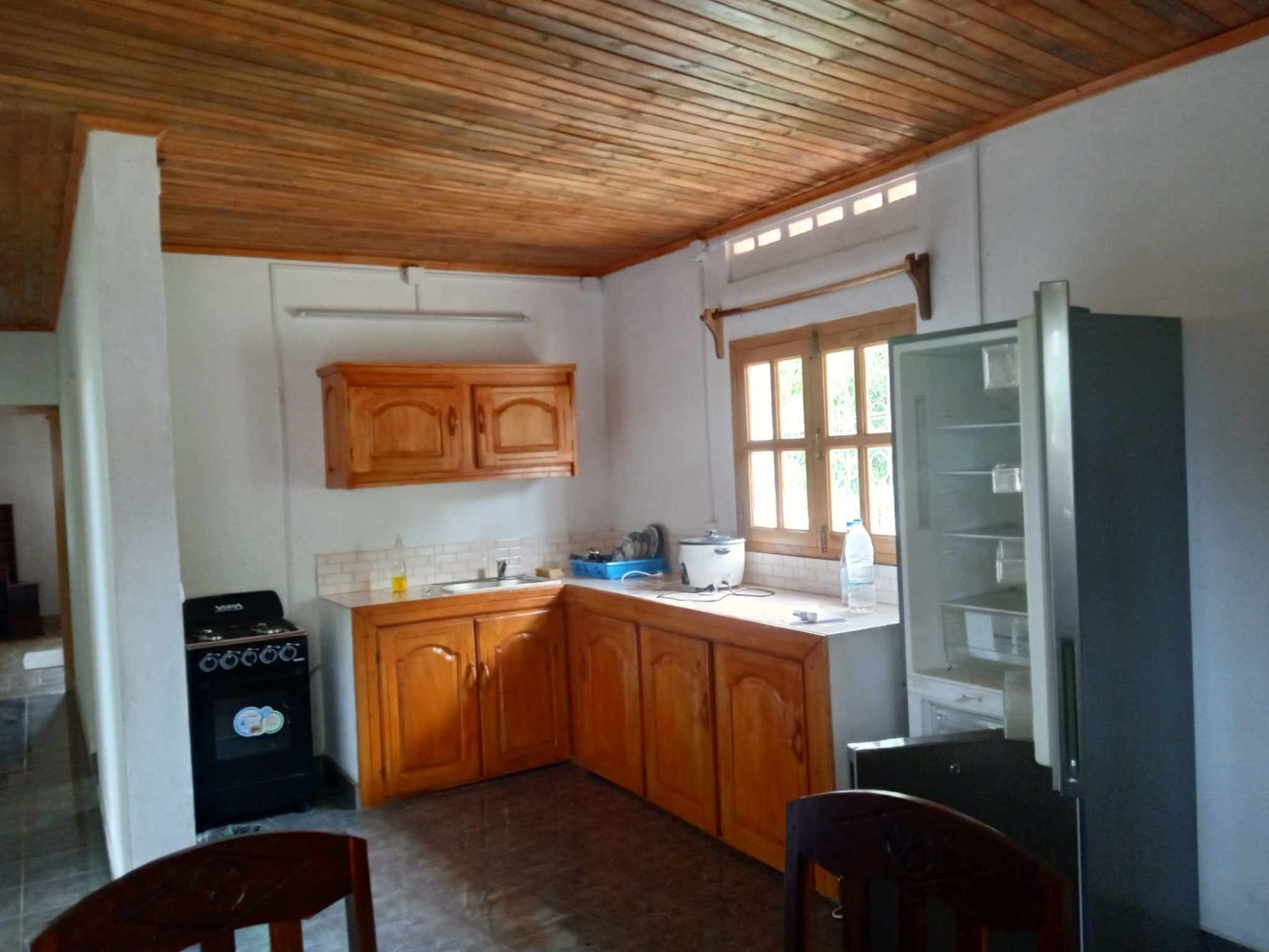 - Ustensiles de cuisine complets, couvert pour 6 personnes, frigo, gazinière 4 feux avec four, Rice cooker, etc.